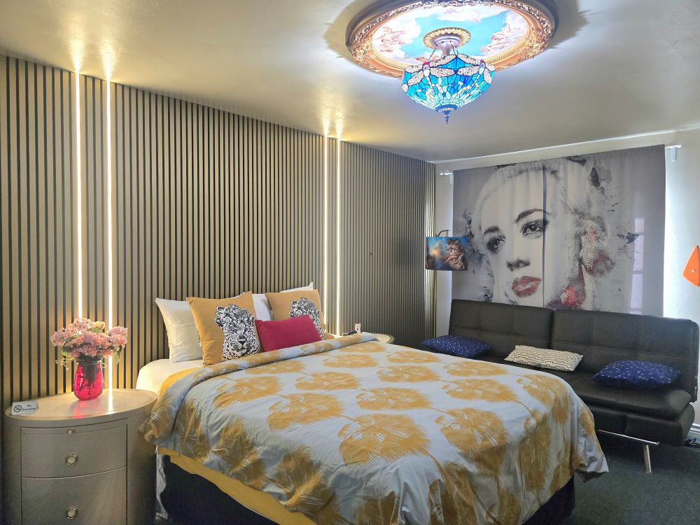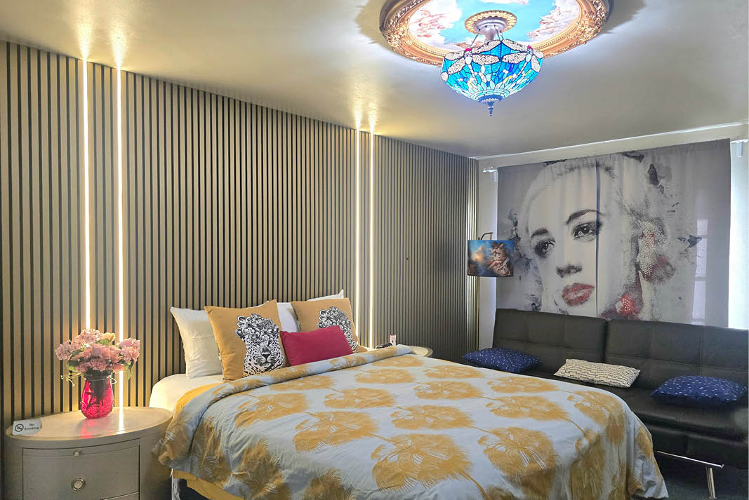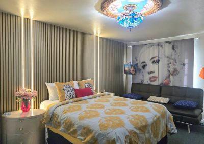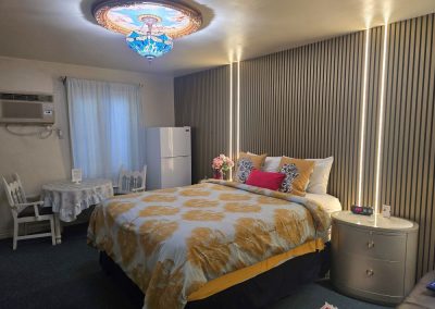 The room features a Queen bed with a firm 14″-thick mattress, 1 full-size sofa-bed with designer floor lamp, Tiffany light with ceiling medallion, and juke-box radio with blue-tooth. Amenities include a 40″ flat-screen TV, shared 200-Mbs WIFI, card table with chairs, desk with outlets, microwave, medium refrigerator, coffee maker, and carport next to room. The bathroom features wood-like porcelain tiles, giving the bathroom a spa-like feel. The unit is ideally suited for peak season during Coachella / Stagecoach / Desert Daze / Glen Helen / NOS music festivals, or the motorbike Raceways.