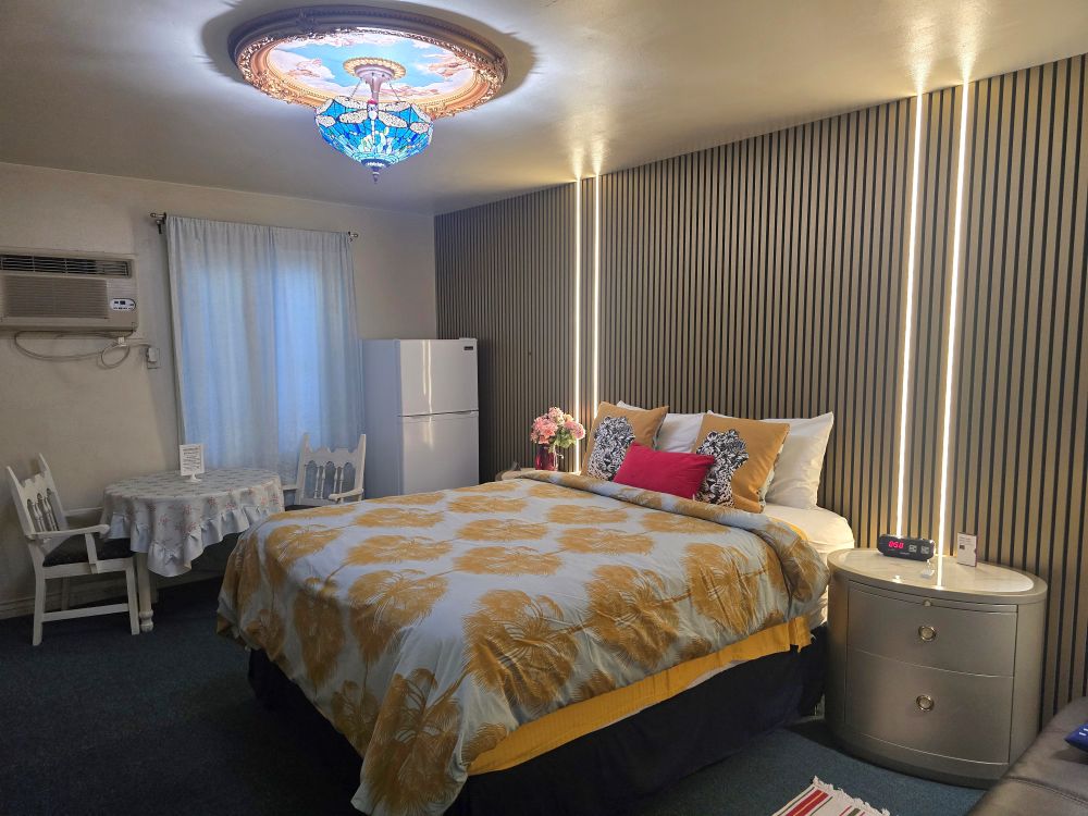 We are a small vintage 50’s complex off the beaten track on the Historic 395 Route with both nightly motel rooms and extended-stay leasable individual apartments. We kept the outside looking retro for historical charm. Inside the units have been renovated. Furnishings are brand new. Some of the other units feature a separate and windowed kitchen equipped with a full stove and eating area. Most of these are occupied. Historically, we have had occupants (maids, handymen, some guests) live here permanently for decades. Each stopped by on a spur, and then stayed then on. The internet is fast; we provided a complimentary Roku device for free movies and tv; but bring your own Roku, AppleTV, or Firestick device if you have special subscriptions. Check out our live-size dinosaurs and tree gardens! Good for photo ops!
